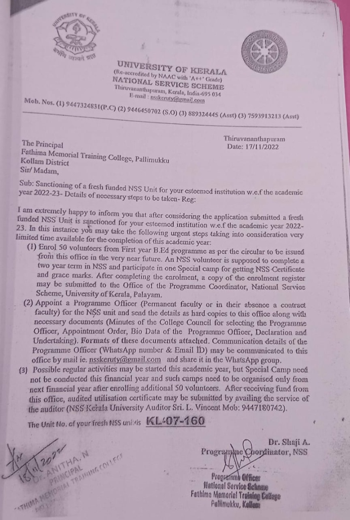 NSS- SANCIONED ORDER OF UNIVERSITY OF KERALA