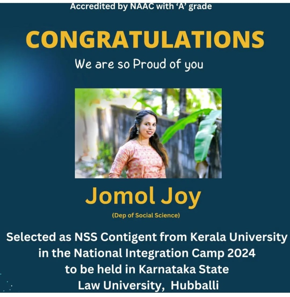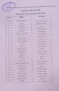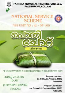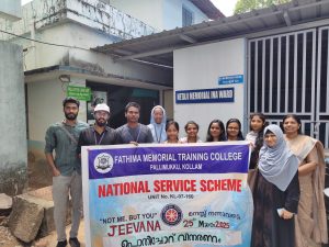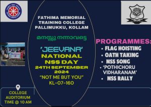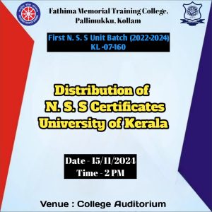 The national service scheme (NSS) established on 2023 with an intake of unit of 50 students sanctioned by the university of kerala ,aims at developing students personality through community services.As a voluntary association of young people,NSS help them to be active in the process of nation building.NSS unit in the institution is very active with various extensionactivities and service oriented programs.The students get opportunities to participate in many interactive session and personality development ventures and thus they become citizens with responsibilities of taking care of the people and environment around them
