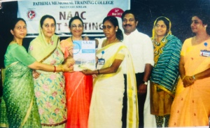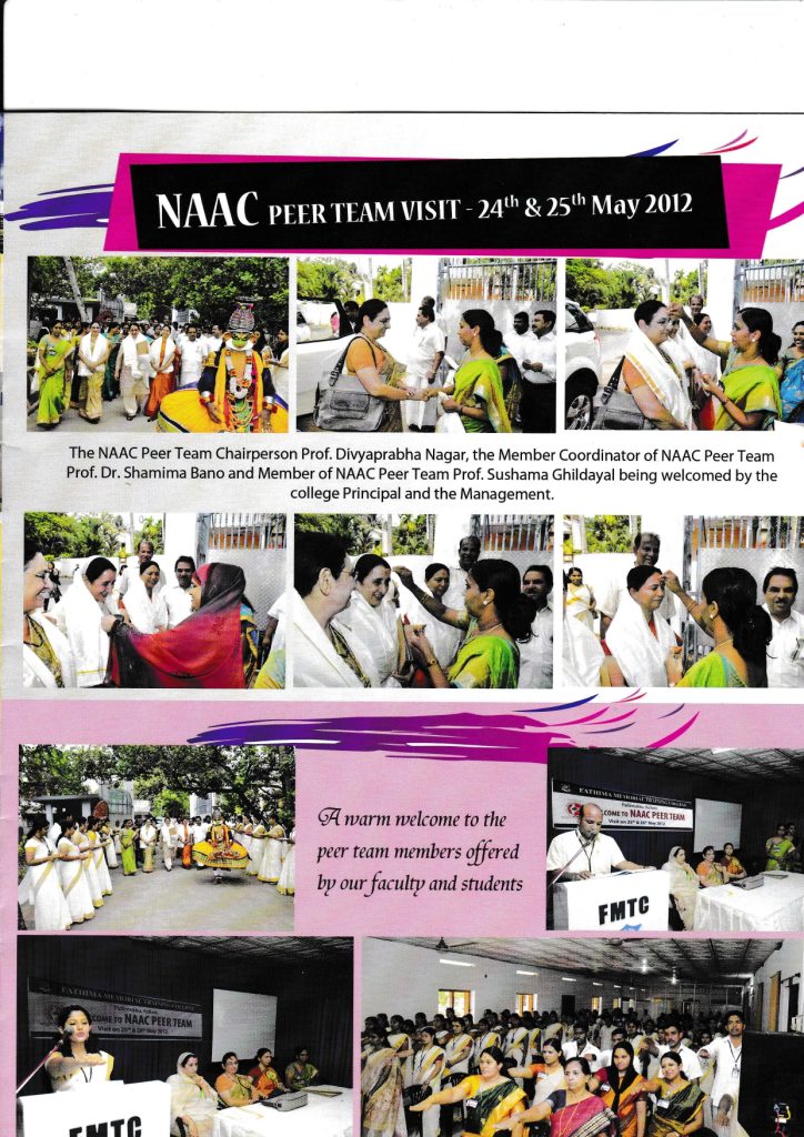 The peer team of the NAAC(National Assessment and Accreditation) Council a catalytic agent in bringing quality and excellence in higher education consisting of three eminent academic experts: Prof. Divya Prabha Nagar (Vice chancellor, Rajasthan University), Dr Shamima Bano (Rtd. Principal, College of Teacher Education Jammu & Kashmir) and Prof. Sushamma Ghildyal (Professor and Head, Dept. of Physical Education,BHU, Varanasi) Visited the Institution on 24th and 25th May 2012. The Fathima Memorial Training College offered a cordial welcome to the team members